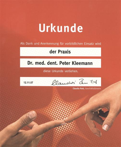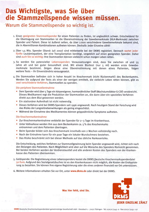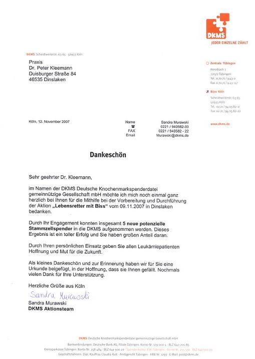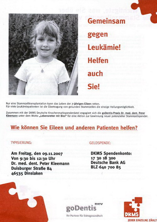 Vielen Dank allen unseren Patienten und Mitarbeitern , die durch ihre Teilnahme an der "Knochenmark-Typisierung" in unserer Praxis am 9. Nov. 07 ein Zeichen der Nächstenliebe setzten.