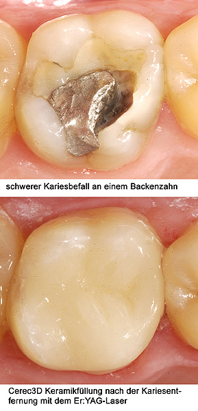 Unter einer minimalen Betäubung wird der zu behandelnde Zahn vorsichtig von seinen alten Füllungen befreit. Infizierte Zahnsubstanz (Karies) und Bakterien können mit dem Erbium-Laser sanft und sicher entfernt werden, so dass eine zahnnervschonende Unterfüllung platziert werden kann und einen dauerhaften Schutz gewährt.